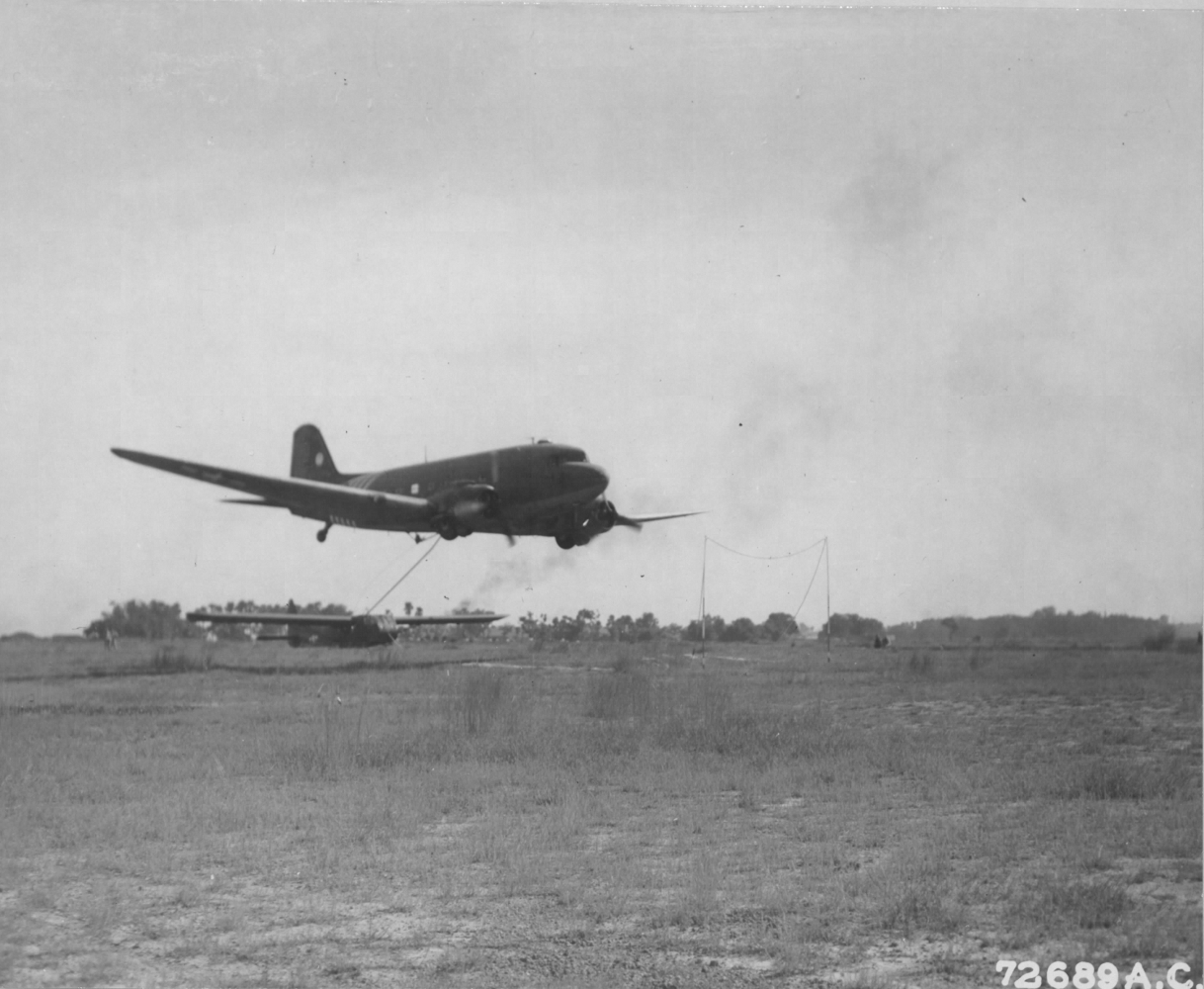 The British commando leader Orde Wingate asked for light aircraft to evacuate his wounded from the jungles of Burma. By the time Philip Cochran arrived in November 1943, however, the light aircraft operation had expanded into a full-blown air task force, later designated the 1st Air Commando Group. In addition to four squadrons of small liaison planes, Cochran and Alison brought two fighter squadrons, a medium bomber squadron, and a troop carrier squadron, which included both C-47 transport aircraft and CG-4 gliders. The gliders were a great innovation. Instead of Wingate’s troops pushing deep behind enemy lines on foot, Cochran and Alison proposed to insert them by air. The gliders could land in jungle clearings, disgorge troops and equipment, and then be “snatched” out again by low-flying transports specially equipped with a hook and reel assembly.