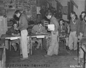 I recently found this photo in the national archives of a few of the 449th Fighter Squadron’s pilots outprocessing from China on 10 October 1945 to return to the United States after the end of World War II.