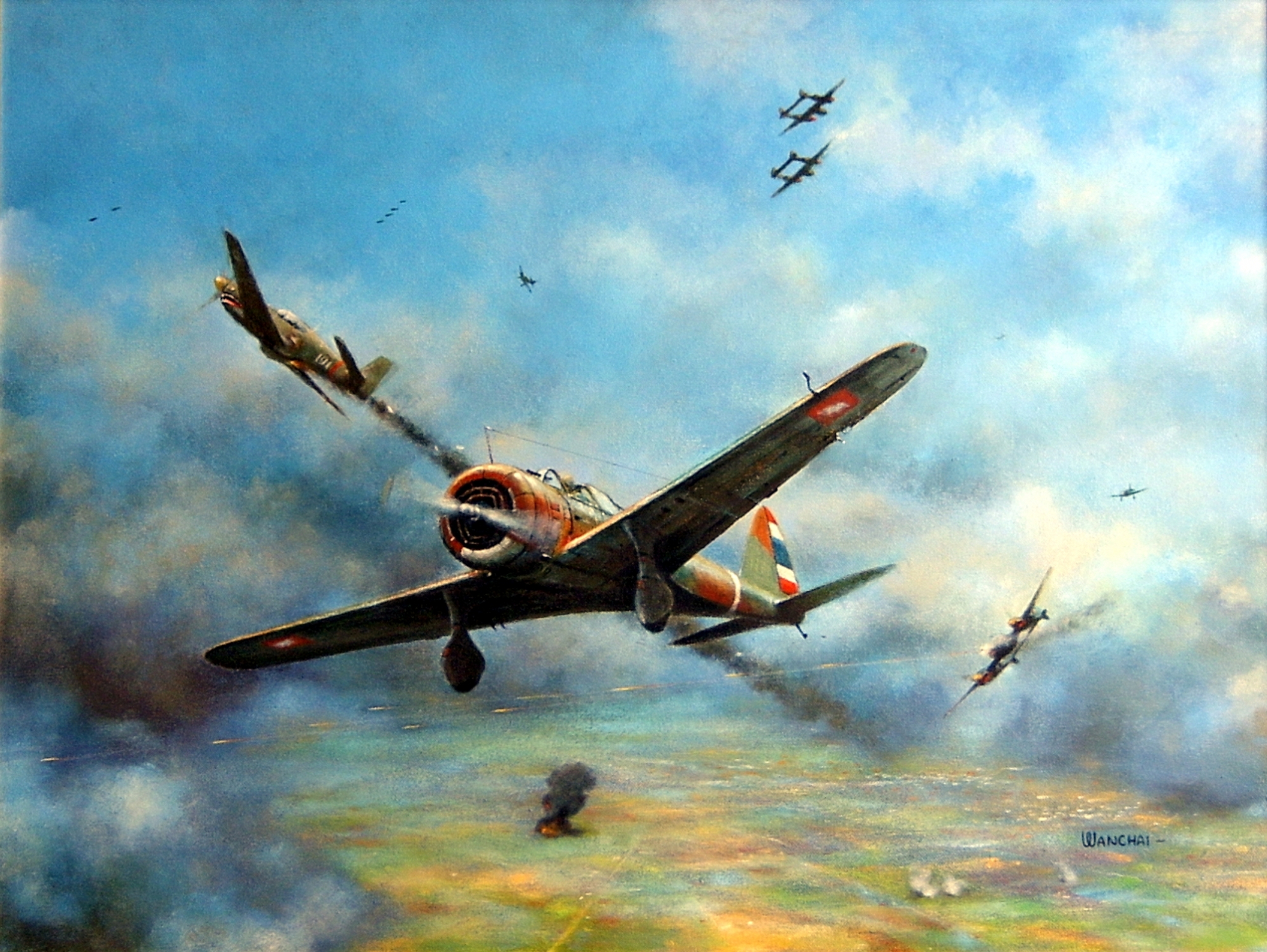 On 11 November 1944, 9 P-51s from the 25th Fighter Squadron and 7 P-38s from the 449th were on a fighter sweep over Thailand when they were jumped by five Royal Thai Air Force (RTAF) Nates. They caught the Mustangs low and shot down Lieutenant Henry Minco. The P-38s had a great deal of difficulty because the Nates were much slower and much more maneuverable than the Lightnings. In the end, however, all five Thai Fighters were shot down, effectively ending opposition to American raids over north Thailand for the rest of the war. These two paintings of the event are courtesy of the RTAF Museum. Notice how the P-51 is painted as an AVG P-40 rather than the diamond-checker tail of the 25th.